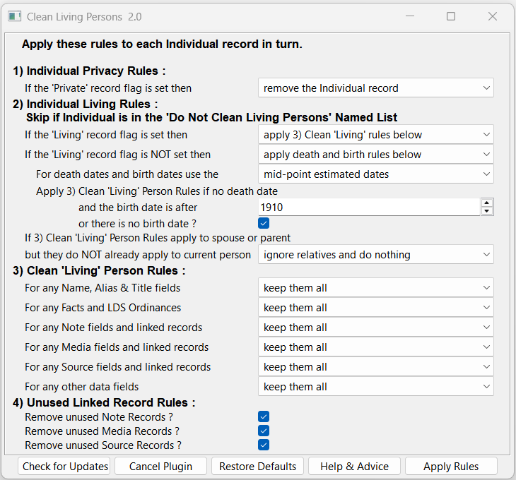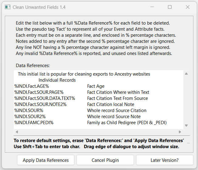This plugin allows any type of Individual Fact, or Family Fact, or Level 1 Tag, to be deleted or changed in bulk.