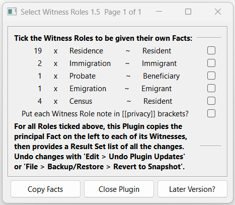 This plugin is intended for Projects imported from products such as TMG and Legacy that support Fact Witness Roles, where it may be desirable to remove certain selected Witness Roles from Facts and create separate Facts for the Witness Individuals instead.