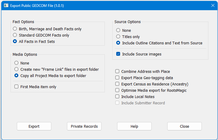 This new plugin provides an alternative and simpler method for exporting your tree plus optional supporting data such as media and outline source citations in a common format optimised for current family history applications and websites, with all references to individuals marked as either Living or Private removed automatically.