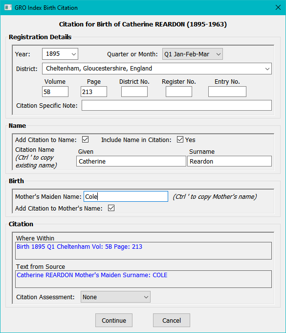 Add a GRO Index Source Citation to an birth, marriage or death with GRO reference in Where Within and additional information in Text from Source; event is created or optionally updated with the date and/or place.
