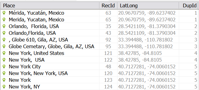 List any Place records whose tidied names would be duplicates and thus should be merged.