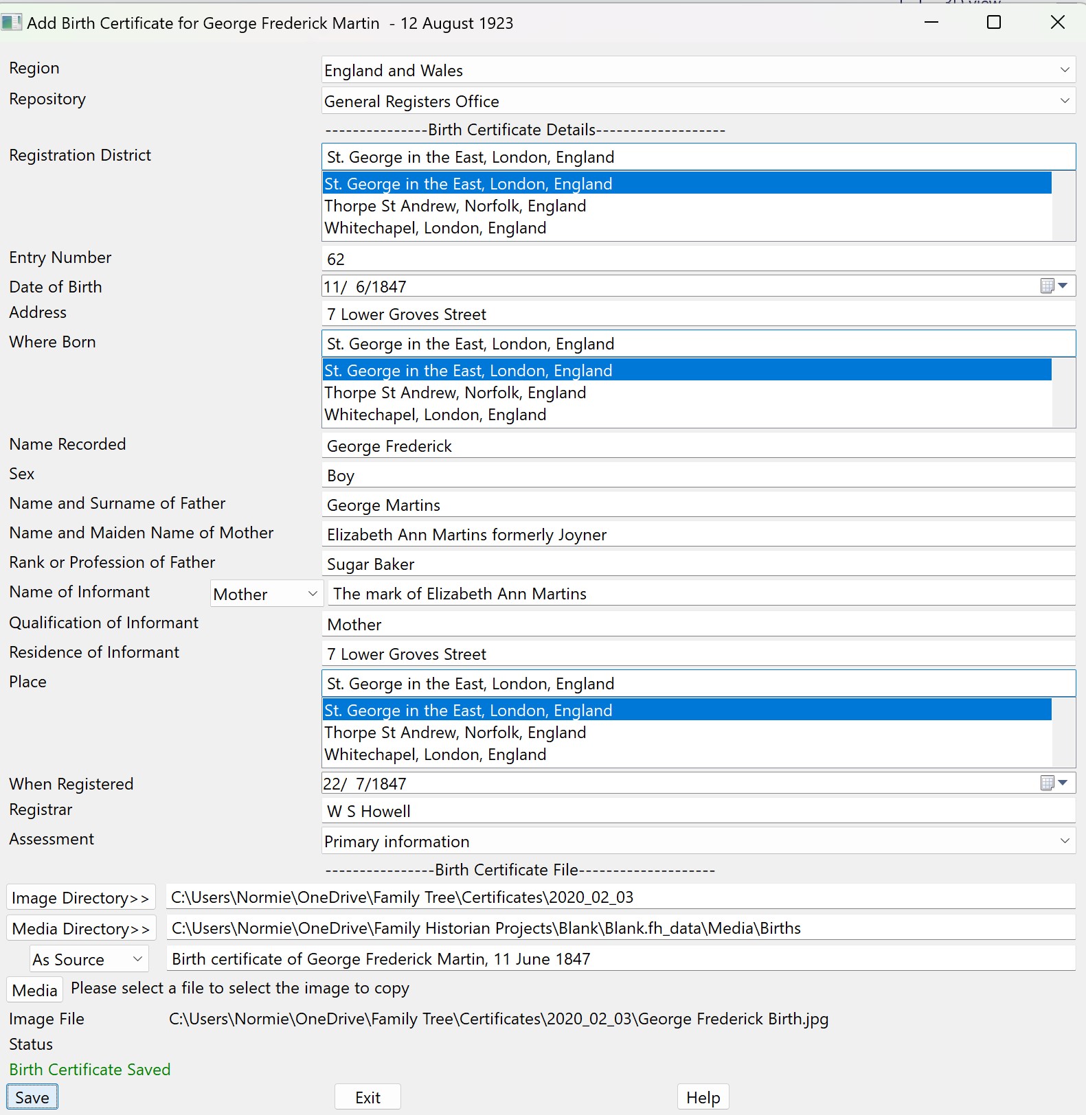 Designed to work with 'Civil Registration Certificate' Source Template from the Essentials collection, it will record the details from a birth certificate, for the current individual, based on the format of the England and Wales Birth Certificate since 1837.